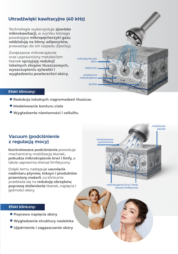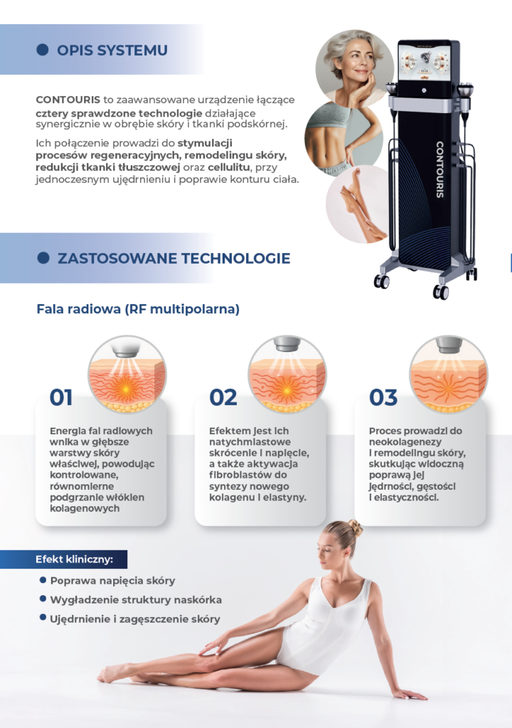 CONTOURIS to zaawansowane urządzenie łączące cztery sprawdzone technologie działające synergicznie w obrębie skóry i tkanki podskórnej. Ich połączenie prowadzi do stymulacji procesów regeneracyjnych, remodelingu skóry, redukcji tkanki tłuszczowej oraz cellulitu, przy jednoczesnym ujędrnieniu i poprawie konturu ciała